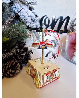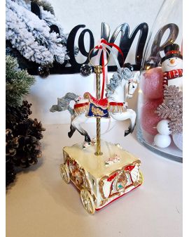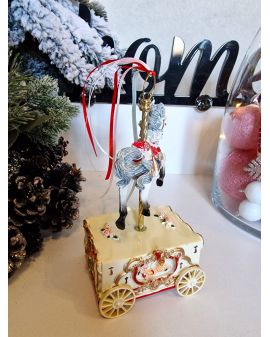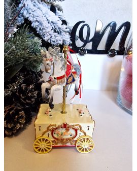 Figurka wykonana jest z ceramiki wysokiej jakości malowana specjalnymi lakierami. Pozytywka bożonarodzeniowa z mikołajem w saniach i reniferami. Po nakręceniu wybrzmiewa kolęda.