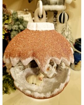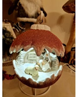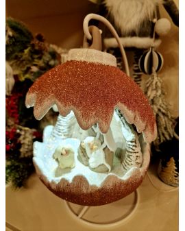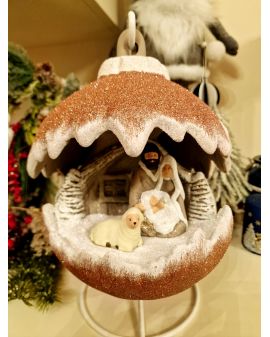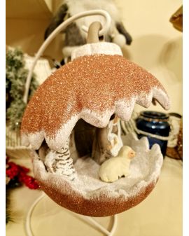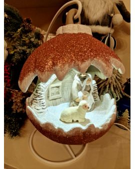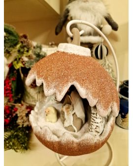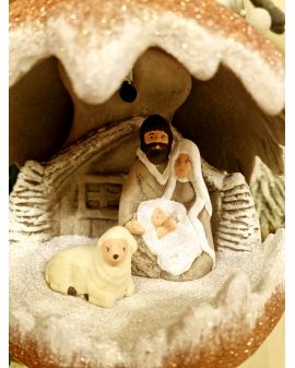 Figurka wykonana jest z ceramiki wysokiej jakości malowana specjalnymi lakierami. Szklana kula z pozytywką z modelem szopki bożonarodzeniowej. Po nakręceniu wybrzmiewa kolęda.