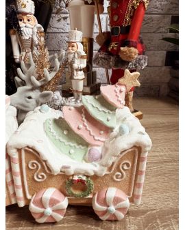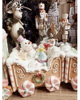 Figurka wykonana jest z ceramiki wysokiej jakości malowana specjalnymi lakierami. Pozytywka bożonarodzeniowa z mikołajem w saniach i reniferami. Po nakręceniu wybrzmiewa kolęda.