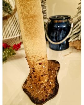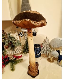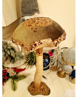 Grzyb wykonany z weluru w zielonym kolorze, ozdobiony brokatem, to stylowy element dekoracyjny, który doda charakteru każdemu wnętrzu. O wysokości 51 cm, grzyb doskonale nadaje się do wyeksponowania na półkach, stołach czy w donicach.