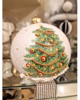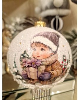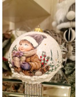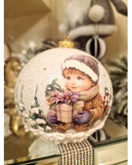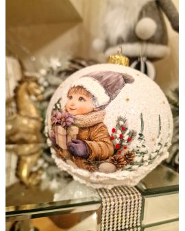 OZDOBA ŚWIĄTECZNA - DUŻA BOMBKA 120 mm decoupage DZIECI - chłopczyk z prezentem