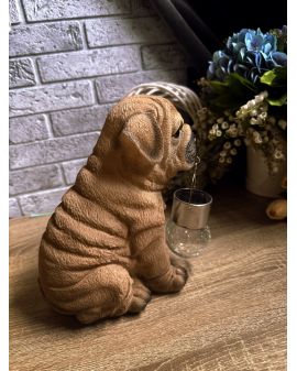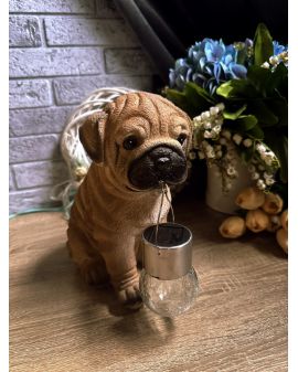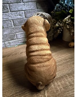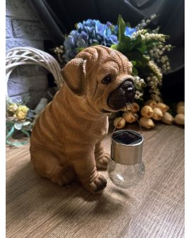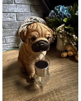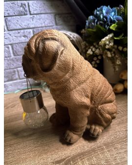 MAŁY SIEDZĄCY BISZKOPTOWY SZCZENIAK MOPSA Z LAMPKĄ