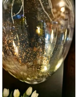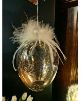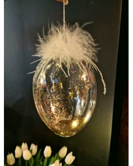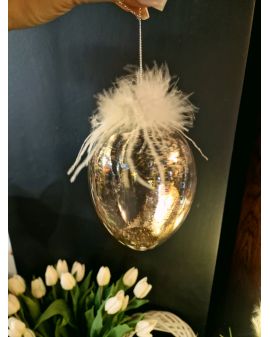 Dodaj odrobinę blasku i elegancji do swojego wnętrza dzięki temu wyjątkowemu szklanemu jajku dekoracyjnemu. Starannie wykonane, zachwyca delikatnym połyskiem brokatu oraz subtelnymi piórkami, które nadają mu lekkości i niepowtarzalnego charakteru.