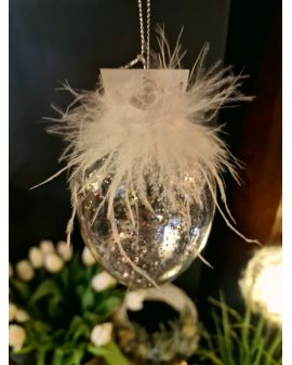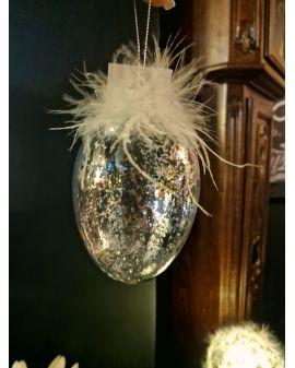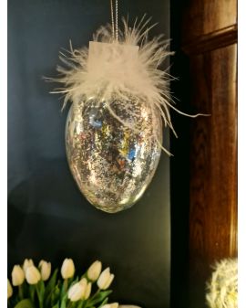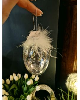 Dodaj odrobinę blasku i elegancji do swojego wnętrza dzięki temu wyjątkowemu szklanemu jajku dekoracyjnemu. Starannie wykonane, zachwyca delikatnym połyskiem brokatu oraz subtelnymi piórkami, które nadają mu lekkości i niepowtarzalnego charakteru.